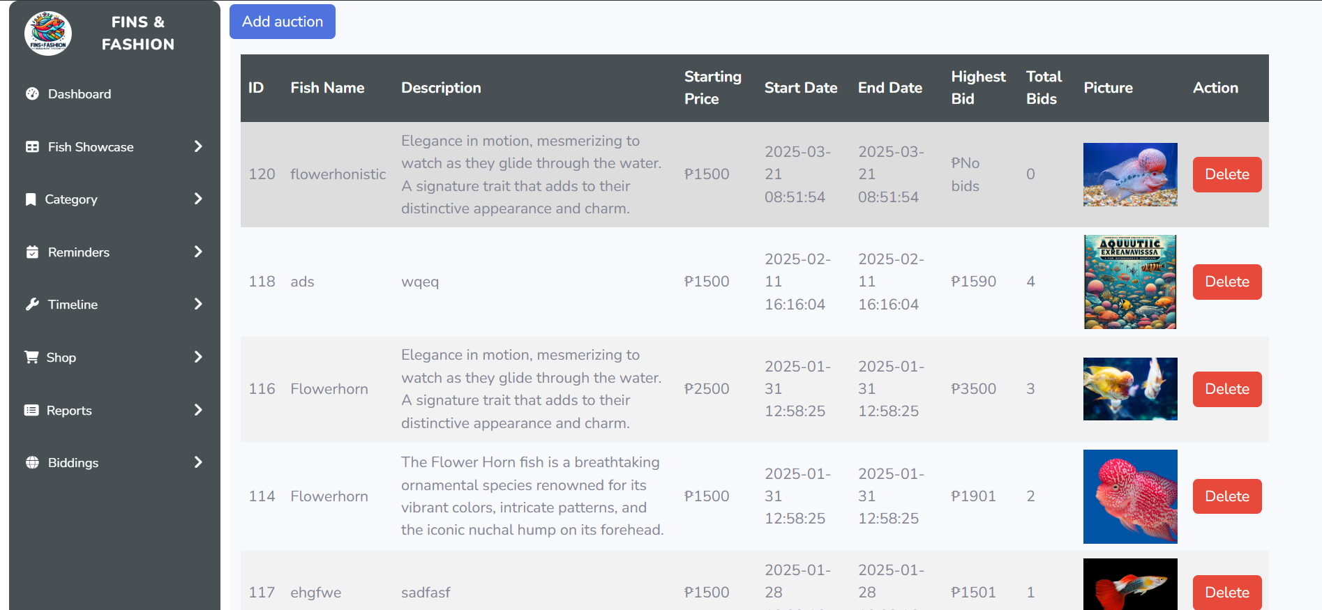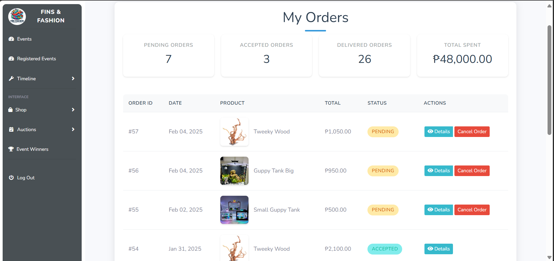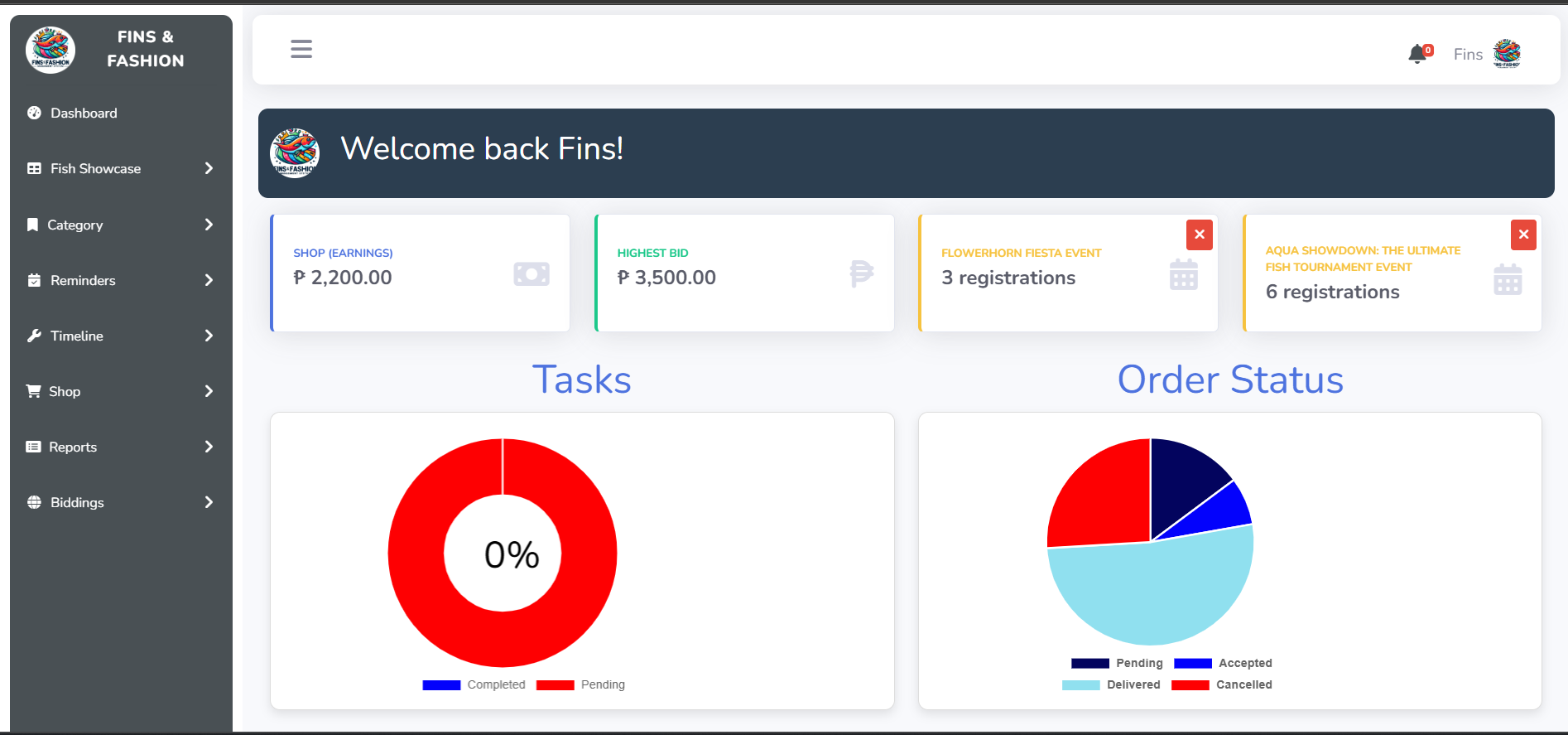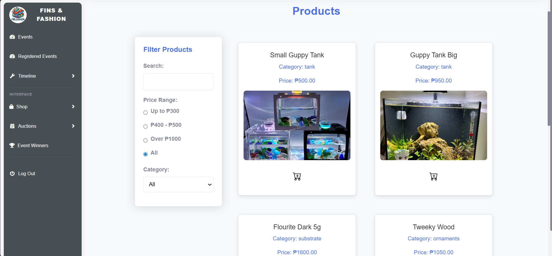 A system built for fish hobbyists and organizers, featuring event management, e-commerce, and bidding. Admins can create events and auctions, while organizers manage their online shop. Users can register for events, place bids, and purchase items streamlining the experience for the fish enthusiast community.
